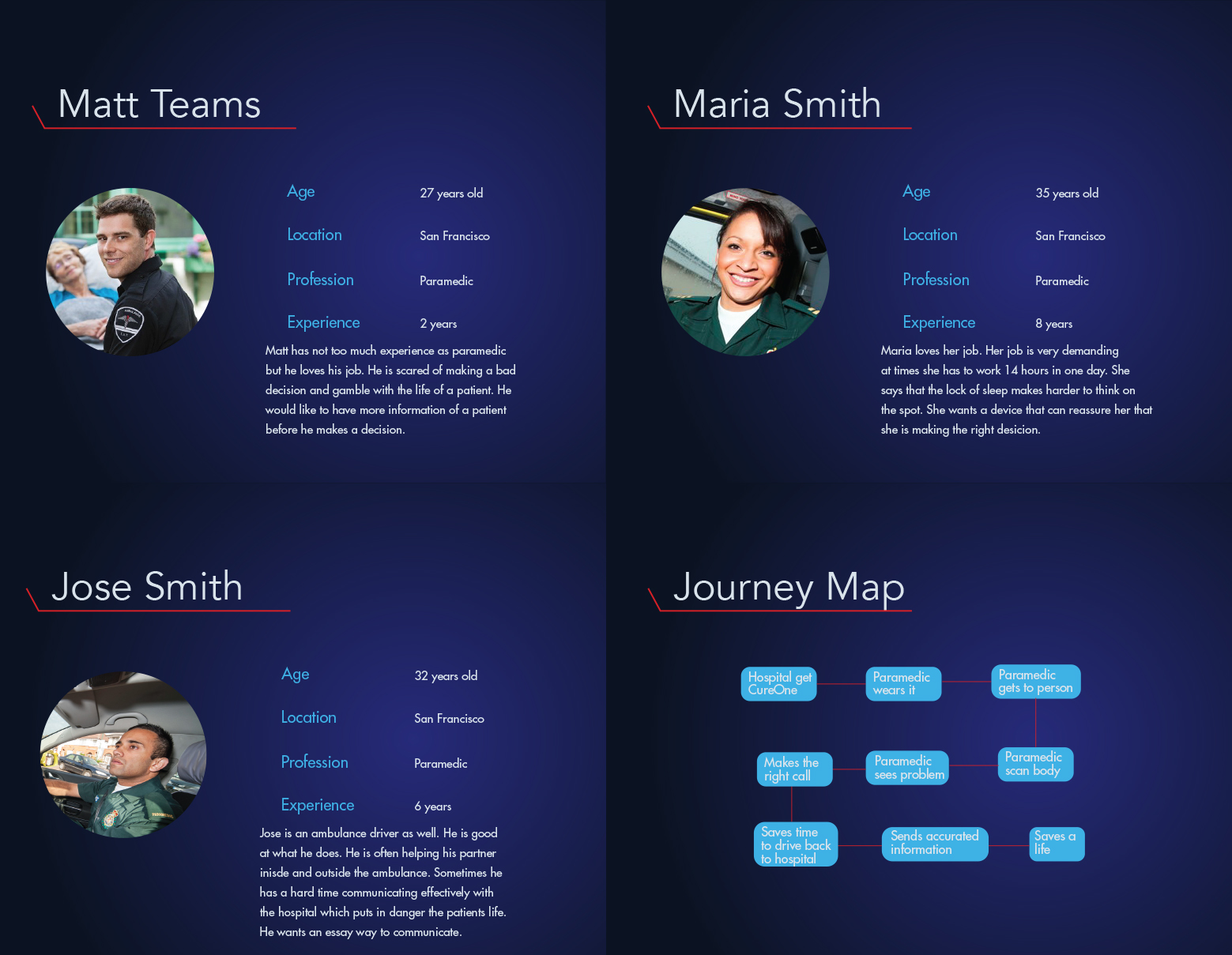 These glasses are designed to help paramedics when responding to emergent situations. The purpose of the glasses are to quickly scan the patient's body to reveal their health status and any underlying issues that cannot be seen with the naked eye. This helps paramedics make accurate and swift decisions regarding the treatment of the patient which increases survival rates. The glasses will also send live updates to local hospitals so they can be prepared and ready for when the patient arrives.